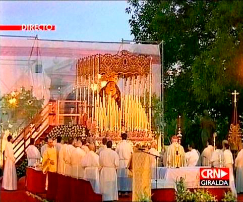 En el ejemplo anterior se contaba con archivos de buena resolución y se pudo realizar una cartelería de calidad sin estar pixelada pero por ejemplo en este otro trabajo, en el que realicé el fondo de la Coronación Canónica de María Santísima de la O de Sevilla, realicé la fotografía sin la suficiente calidad para un gran formato y tuve que adaptar el diseño para que quedara bien. No sólo es importante contar con buen material a la hora del trabajo sino también tener recursos e inventiva a la hora de utilizarlo.
